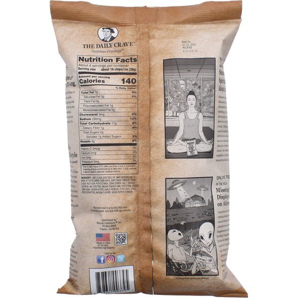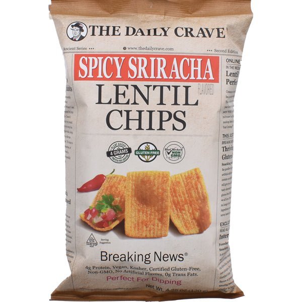 Lentils Chips Spicy Sriracha Ingredients: Lentils flour, corn flour, expeller pressed sunflower oil, rice flour, corn starch, potato starch, salt, green pepper powder, sugar, spices, yeast extract, garlic powder, hot sauce, aged cayenne pepper, vinegar, salt, garlic, maltodextrin (made from corn), natural flavor, paprika extract. 3g Protein, Gluten-Free, Kosher, Non-GMO, No Artificial Flavors, No Hydrogenated Fats, 0g Trans Fats. Product of USA